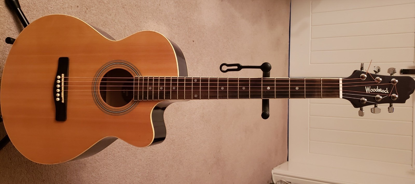 Left handed electro- acoustic from well respected brand woodstock, laminated Spuce top with basswood neck, back and sides. Rosewood equivalent finger board, Ivory binding. Chrome die cast mcahine heads with EQ MET-.A11
