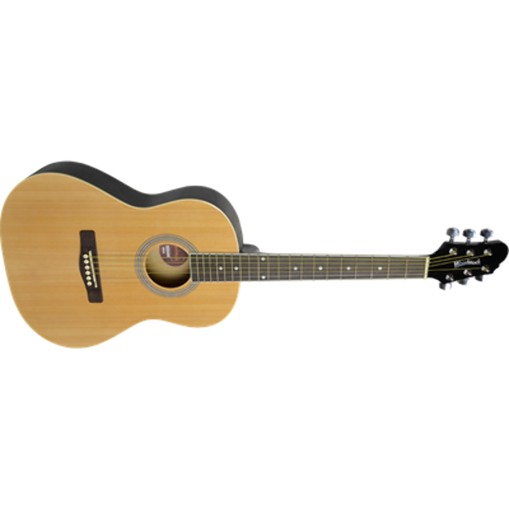 The Woodstock WHW40201 3/4 is a smaller, 3/4 size folk acoustic guitar, ideal for younger players or those needing a portable instrument, featuring a laminated spruce top, basswood body, rosewood-equivalent fingerboard, chrome tuners, and pinstripe rosette.